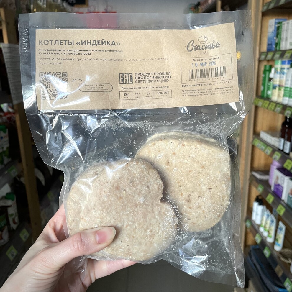 Состав: филе индейки, лук репчатый, вода питьевая, яйцо куриное, соль пищевая, перец черный;