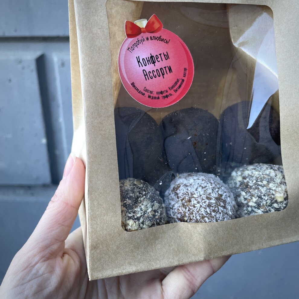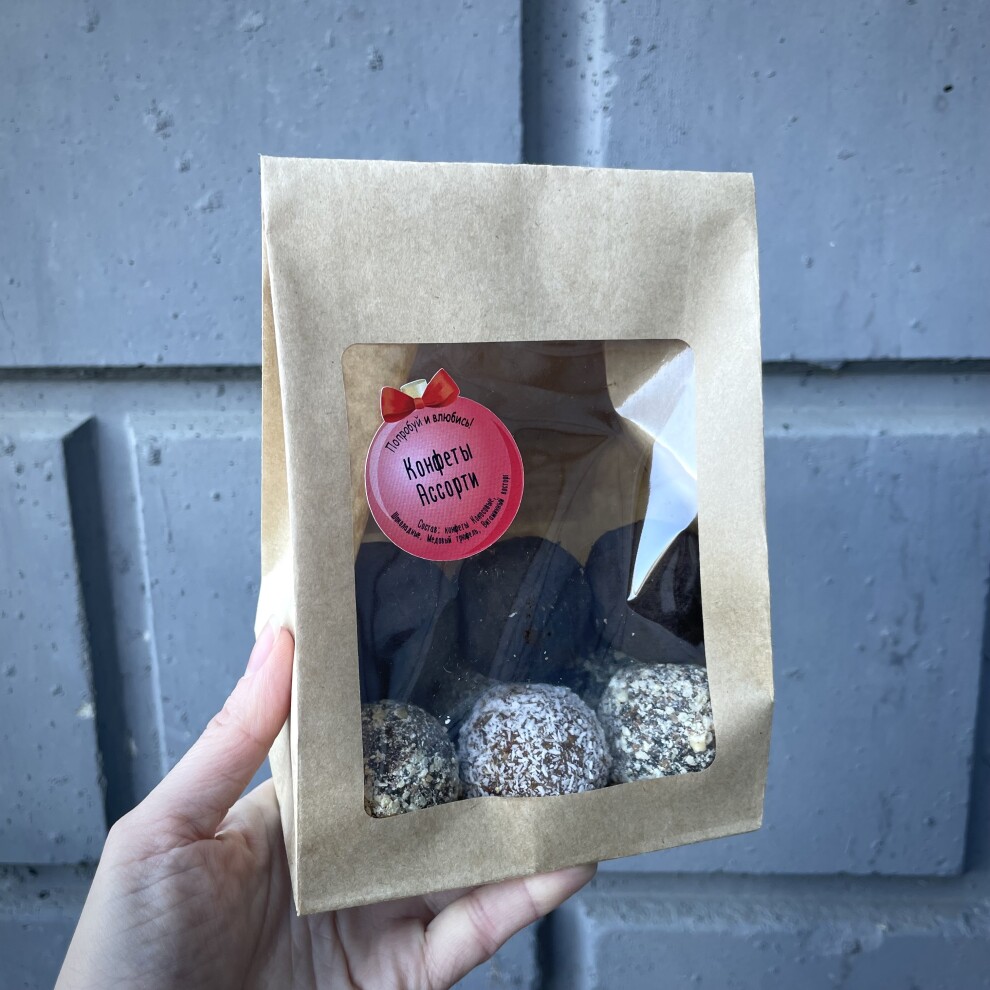 В наборе Ассорти 4 вида конфет: Кокосовые, Витаминные, Шоколадные и Медовый трюфель. Пирожные приготовлены вручную из отборных компонентов. 100% натуральный состав. Без сахара. Без глютена. Без лактозы!