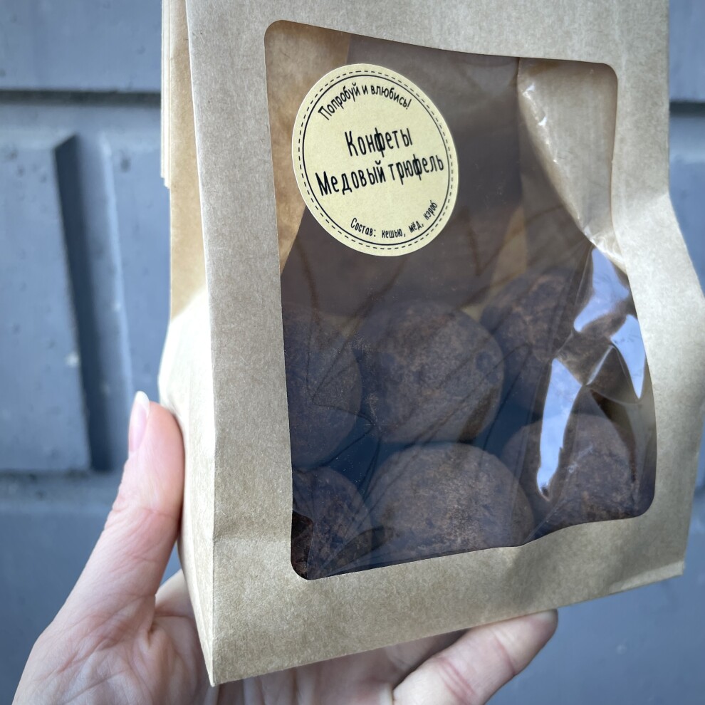 У нашего трюфеля нежная консистенция за счет сочетания дробленого ореха кешью, органического Алтайского мёда и шоколадного кэроба. Сладости идеальны для взрослых и гиперактивных детей так как кэроб, входящий в состав, не содержит кофеин, а значит не бодрит