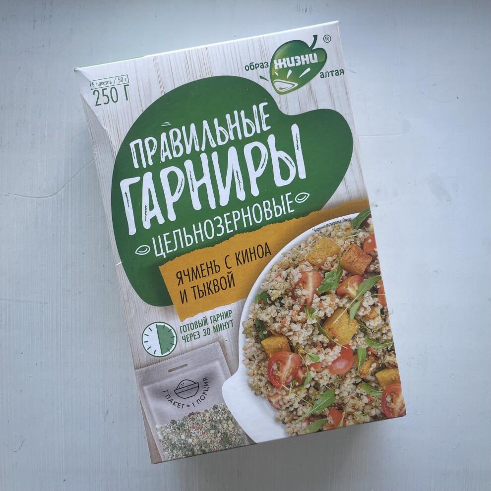 Состав: ячмень шелушений резаный, крупа киноа белая, морковь сушеная, тыква сушеная, лук зеленый сушеный, петрушка сушеная.